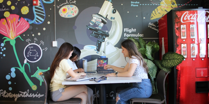 The student lounge features a science-themed mural, comfortable seating, a coffee bar, a soda machine, science-themed puzzles, anatomy and physiology study cards, an Evolution of STEM LEGO set and houseplants.